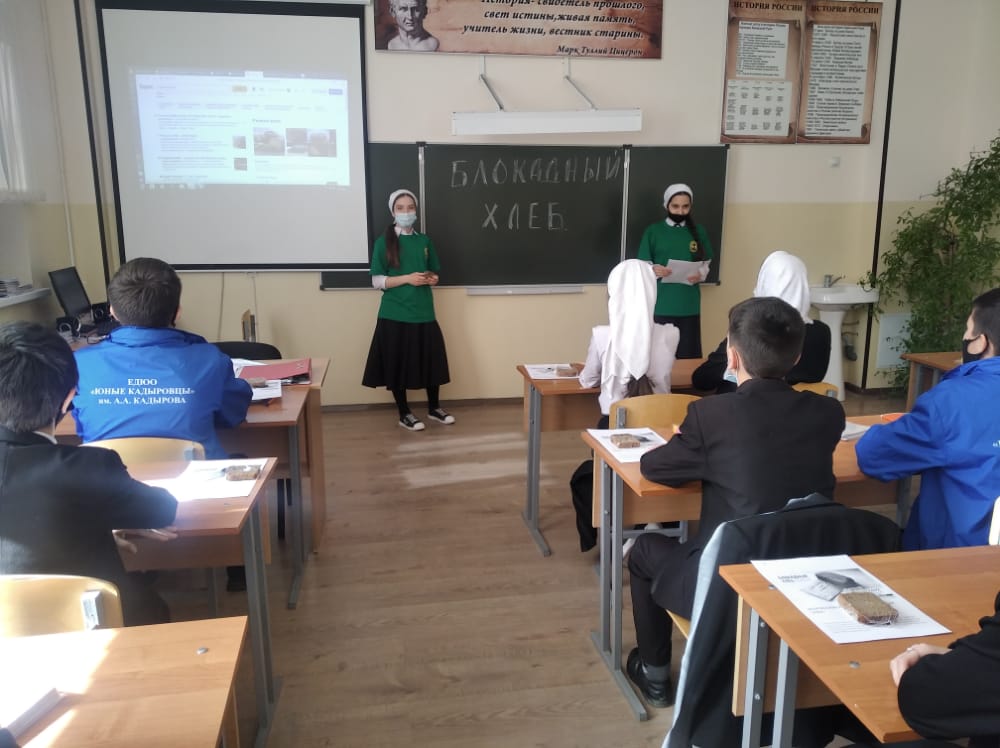 26.01.2021В МБОУ "СОШ # 8 им.Арби Вахаева" 26 января активисты ЕДЮО " Юные Кадыровцы" провели классные часы в 8-9 классах в честь освобождения Ленинграда от блокады. Также провели классные часы в младших классах " Блокадный хлеб". Акция памяти "Блокадный хлеб" призвана напомнить о мужестве жителей Ленинграда, переживших беспрецедентную блокаду миллионного города вражескими захватчиками.Блокада Ленинграда во время Великой Отечественной войны длилась 872 дня. За время блокады от голода и лишений погибло почти 700 тысяч ленинградцев.Детям рассказали о тяжёлых днях той жестокой войны и о том, почему кусочек этого черного хлеба является символом блокады.Кусочек хлеба - весом 125 грамм был пайком на целый день и делали его не из пшеничной муки, а из ржаной муки до 70%, целлюлоза пищевой до 10%, а остальное - это обойная пыль выбойки из мешков или хвоя. Также о Блокадном хлебе рассказали и дети младших классов.